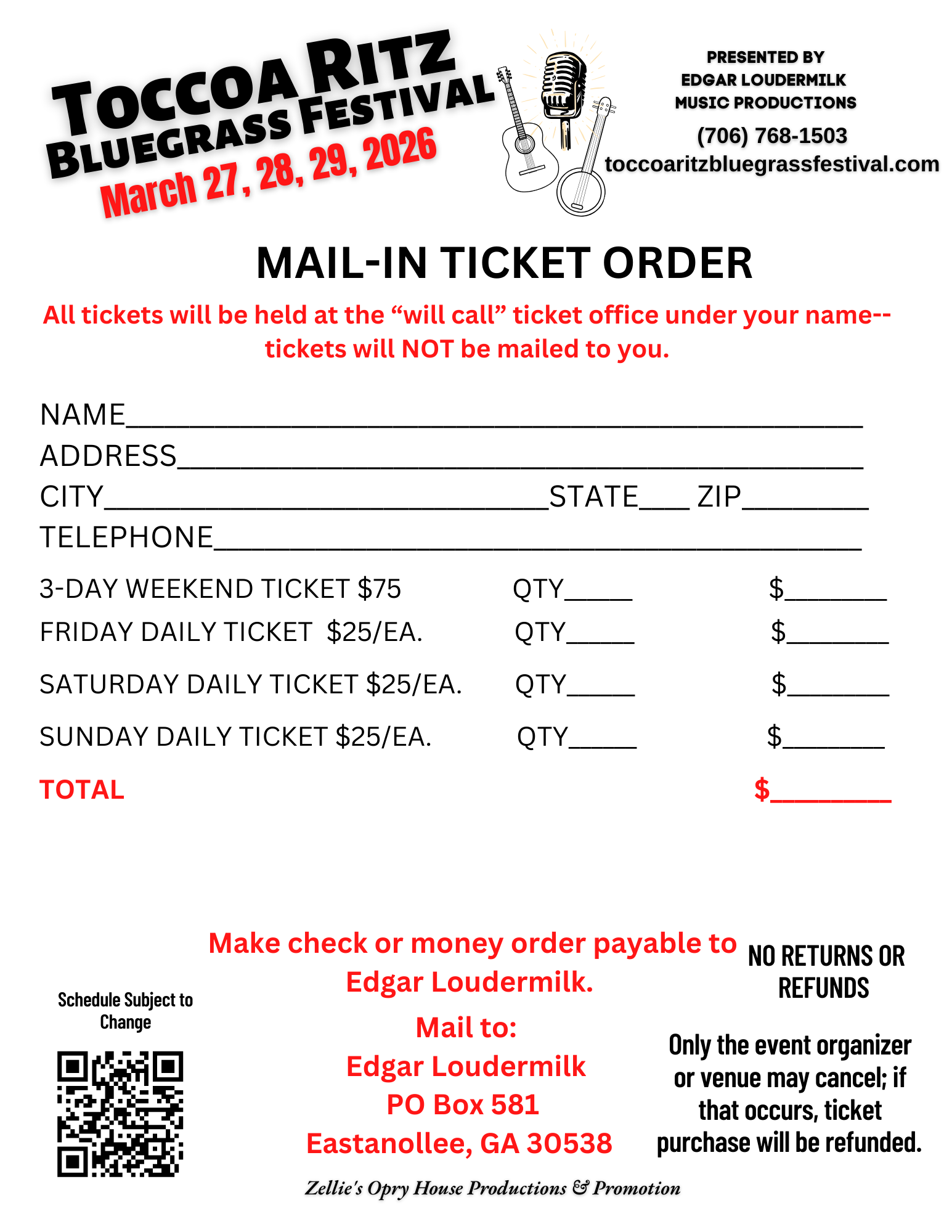 Beware of on-line ticket scams from “third party” individuals. This site will be the ONLY official ticketing site for the Toccoa Ritz Bluegrass Festival. Tickets offered on other sites or by scammers will not be honored. Use our secure ticket link below for all online orders. We also offer mail order tickets.